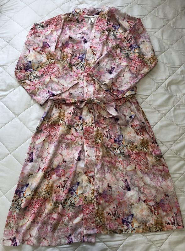 Гарний легенький халатик в доброму стані. Розмір вказаний 14-16, але краще орієнтуватися на заміри- маломірить Довжина 100 ПОГ 51 ПОТ 53 ПОБ 54 Є внутрішні стрічки