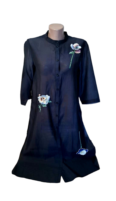 Халат из легкой полупрозрачной ткани темно-синего цвета. Состав: 65.8% хлопок, 34.2% шелк. Вышивка и объемная аппликация из вышивки спереди и сзади. Халат на пуговицах, по бокам длинные разрезы. Длина - 107,5 см, ширина под руками - 50 см, длина рукава - 41 см.