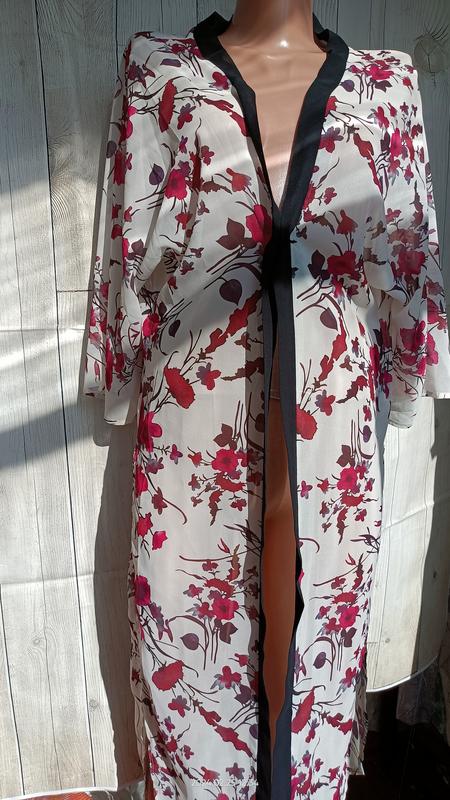 Размер S. подойдет и на М. без пояса, без застежек. со стороны глубокие разрезы. Рукав 3/4