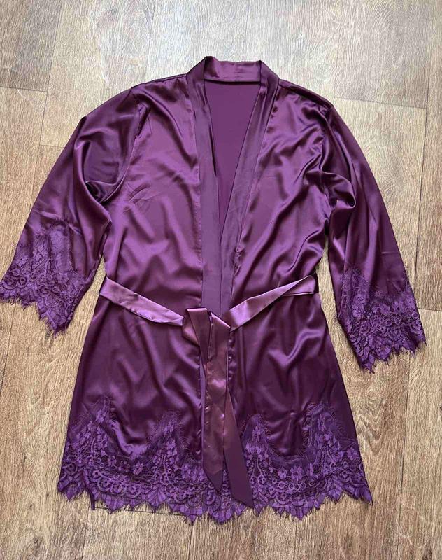 Халат з кружевними вставками, розмір М, довжина 87 см, напівобхват грудей 52 см, довжина рукава 51 см, є пояс