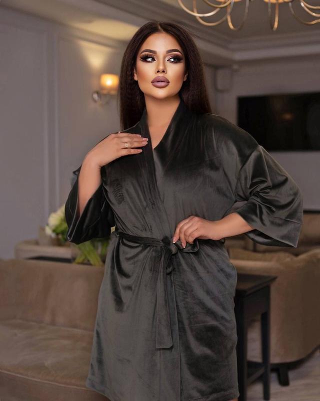 Халат розмір 42-46,48/52 тканина велюр коляри-пудра,сірий,беж,чорний Велюровий халат незамінний у будинку. Він зручний, комфортний, не заважає рухам. Зав'язується під пояс **********-52 120 **********-52120 ДОВ по центру сп 42-44 91,46-48 92 ДОВ рукава від горловини 42-44 54,46-48 55 mil