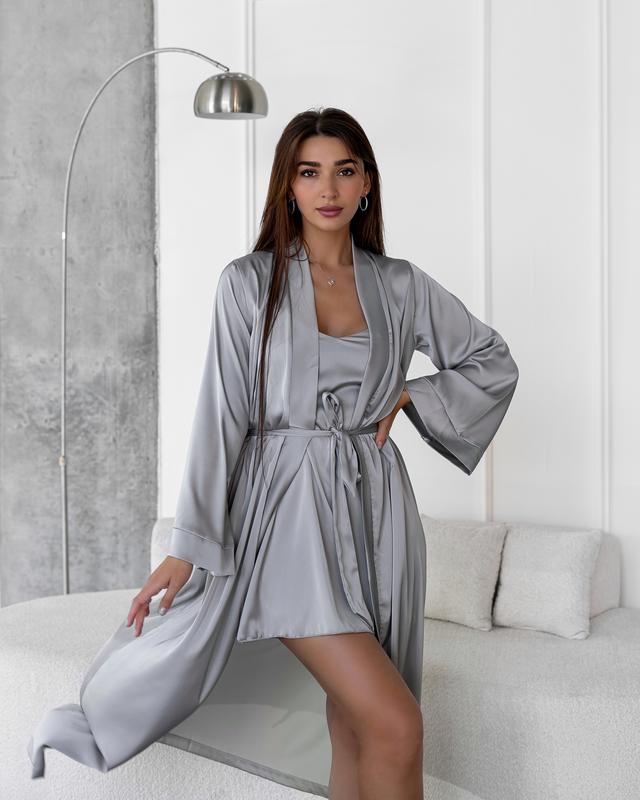 набор длинный халат и ночная рубашка. Халат длинный, на запах. Рубашка на бретелях, ботели регулируются. Ткань: Шелк армани Идут в размере: S-M, L-XL немного маломерит, замеры⬇️ Цвет: серый Замеры: S-М: OГ~ 94 см, ОБ ~97 L-XL: OГ~ 98 см, ОБ~ 102 см Длина рубашки ~ 88 см Длина халата по спинке ~1,30 см. Возможные различия 1-3 см. Есть наложенный платеж по предоплате, все фото реальные приема ❤️