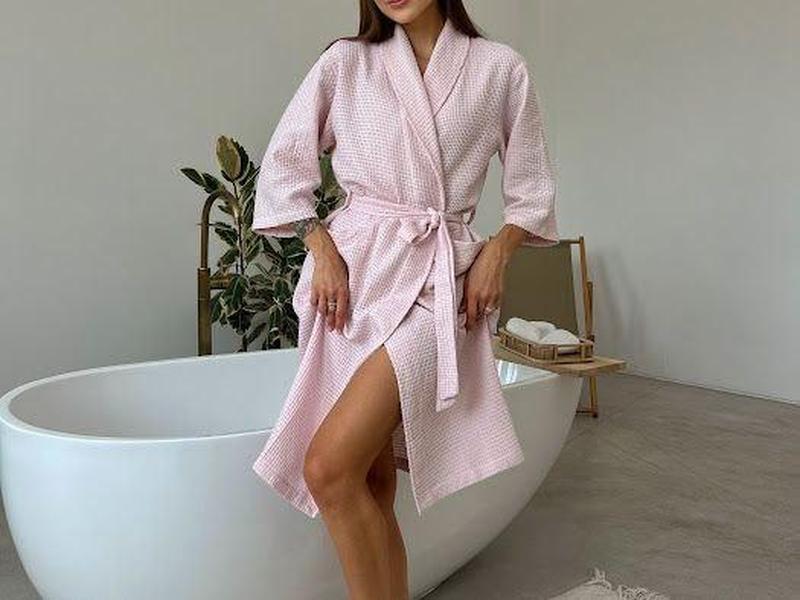 Женский халат вафельный на запах в нежно розовом цвете с шалевым воротником из легкой ткани пике Элегантный женский халат с шалевым воротником -- идеальный выбор для тех, кто ценит комфорт и стиль. Этот халат выполнен из невероятно мягкой и легкой ткани пике с плетением цепочка, что придает ему особую изысканность.Доступные цвета: различные оттенки на выбор. Доступные размеры: S, M, L.Ткань: 100% хлопок, произведенный в Турции. Плотность: 130 г/м².На модели представлен размер S. Параметры модели: обхват груди -- 80 см, обхват талии -- 63 см, обхват бедер -- 90 см. Рост модели -- 1,68 м.Этот халат подарит вам ощущение легкости и комфорта, создавая элегантный образ для дома.