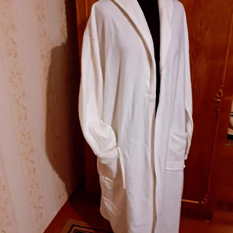 Европейка без пояса по составу флис с полиэстром беленький мягкий с шалевым воротничком с карманами хорошо пойдет как дополнения к ночным рубашкам или пижамкам как накид по длине можно зделать пояс!Дл.127 Пл.63 приспущены в рукава Р 57 Б по 25 Ог 135 Об 145+👍рекомендую!