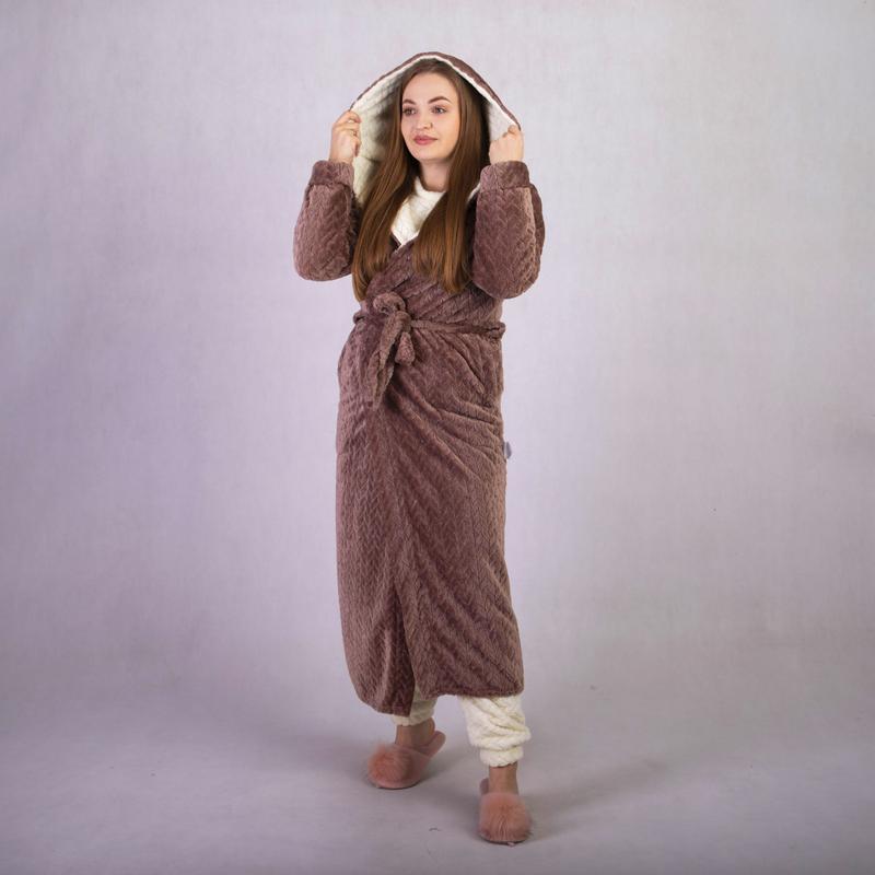 Красивый женский махровый халат на запах, с двойным капюшоном и двумя карманами, полотно махра (вельсофт 3D). Размеры полномерные 42-44, 46-48, 50-52, 54-56. На фото девушка в 42 размере, рост (160 см). Цвета: коричневый, серый, фуксия.