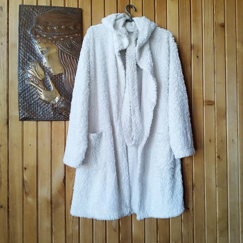Белый махровый халат с капюшо- ном, два кармана, пояс.
