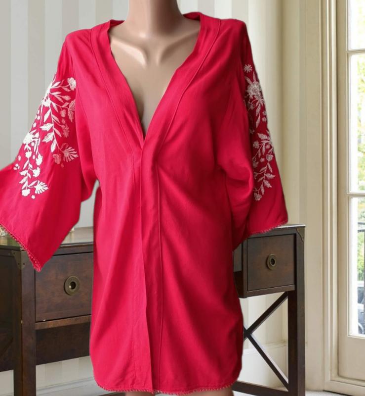 Яркий, милый и стильный халат, накидка для дома, с очень красивой вышивкой на рукавах и оригинальной отделкой по низу изделия и рукавам, не застегивается. Ткань вискоза не просвечивается и не тянется, насыщенного красного цвета. Вимири: (полуобъемы указан с накладкой планки на планку) Полуобхват груди 46 Длина накидки 76 Длина рукава 38 Полуобхват рукава по низу 23 Пройма 32 Ширина плечей 42 Ширина по низу виробу 48 Длина плеча 11 Так как модель свободна, то размер может варьироваться.Стан идеален, без дефектов и консультация заказов.Оформление заказа через кнопку «купить» разрешено после диалога и оплаты вещи на карту. Обращайтесь, пожалуйста, при необходимости сделает дополнительные фото. Товары пересылкиваю Укр-почтой или Новой почтой, отправка по всей Украине. Перед заказом сверьте измерения. После платья, обмена и возврата нет.