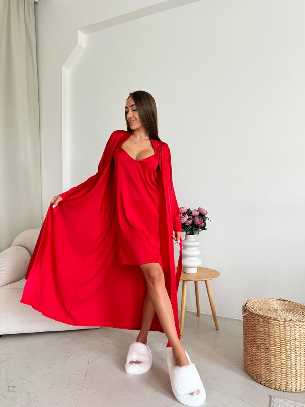 Шелковый набор рубашка и халат макси. Рубашка на брителях которые регулируются. Халат на запах с поясом. Ткань: Шелк Армани. Подойдет на: S-M: ОГ 82-95 см, ОБ 86-96 см. l-XL: 96-106 см, ОБ 96-106 см.