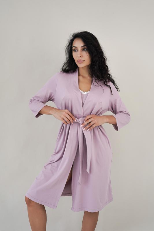 - халат для беременных и кормящих мам на запах с широким вшивным поясом из хлопкового трикотажа. особенности кроя позволяют носить халат в течение всего срока беременности и после рождения ребенка - наличие боковых карманов и длина рукава 3/4 упрощает процесс ухода за малышом Состав: 95% хлопок, 5% эластан. Размер: XS-XL Цвет: зеленый, аметист