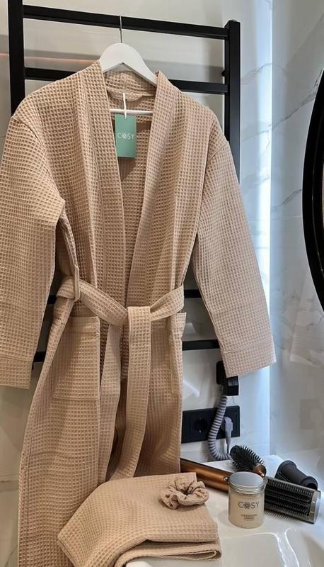 Жіночий Подарунковий набір з халатом в коробці: До складу набору входить: - халат довгий - рушник 70*140 - резинка для волосся - парфумований скарб 450 г Колір: беж (warm sand) Завдяки своїй м'якості та унікальній здатності поглинати вологу вафельна тканина є однією з найпопулярніших серед бавовняних тканин. Вафельні халати добре обсушують тіло, не створюючи парникового ефекту. Тканина: 100% бавовна, Туреччина розміри: S; M; L; XL; 2XL; Рекомендації щодо догляду: 1. Прати у холодній воді (при температурі не вище 40°С), віджимання тільки на малих обертах 400. Не використовувати відбілювачі. 2. Природне сушіння. Рекомендується трохи розтягнути Виріб під час сушіння. 3. Прасувати при високих температурах до 200°С (режим бавовна) з паром. Після прання вафельні клітини збираються, але після висихання та прасування вони розходяться.