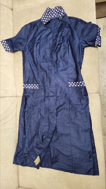 Стильный женский халат в классическом темно-синем цвете с контрастной отделкой белыми узорами на манжетах, карманах и воротнике. Ткань хлопок, мягкая и приятная к телу, обеспечивает комфорт во время носки. Халат слегка приталенный, длиной чуть ниже колен, с короткими рукавами и застежкой на пуговицах. Размер 44-46