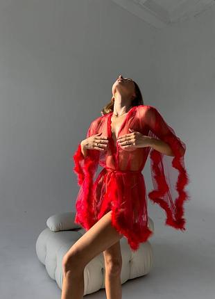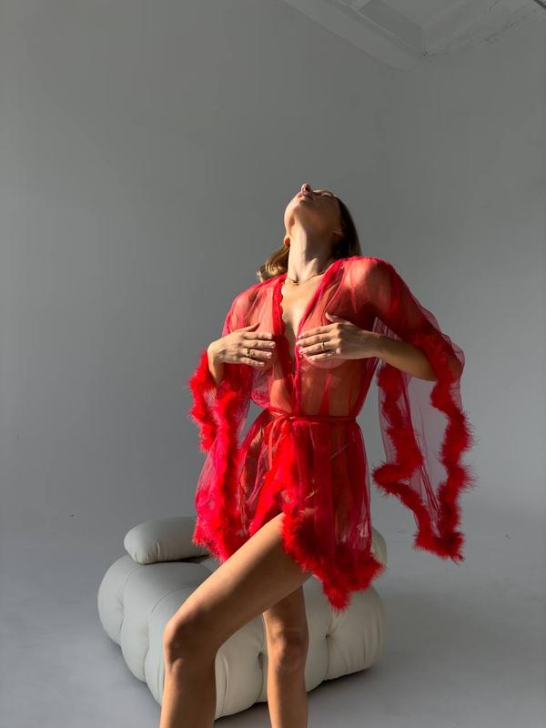 Роскошная новинка) эффектный халатик из мягкого фатина с кружево и перьями. Размеры S, M. Размер по сетке: S: грудь 86-96, бедра 86-98 см М: грудь 96-102, бедра 97-103 см DO3106/1