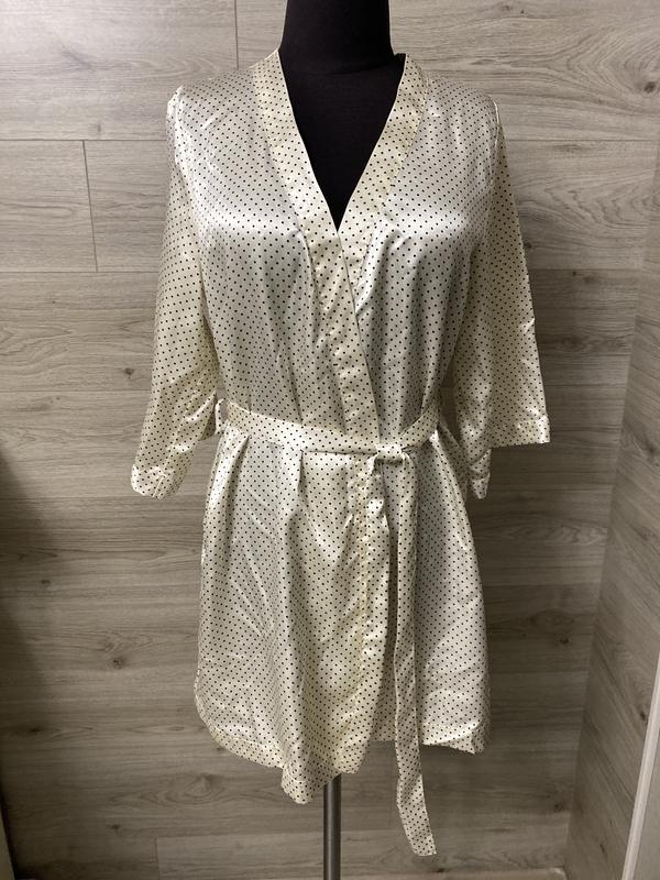 Красивый халат под шелк молочный в мелком горох с 10-12 Под поясок Длина 80 Плечи 34 Рукав 40 Полуобхват груди 47 плюс минус запах Талии 47 Стегон 50 Полиэстер