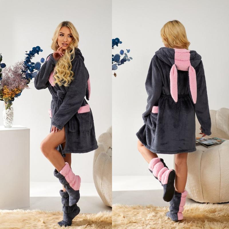 Халат с ушками + сапожки арт. ro. 010 Отличный подарок на праздники Размер: уни 42-46 (Длина халата 90 см, на ОГ и ОБ не более 100 см) Ткань: пушистая, теплая, мягкая махра Цвет: серый