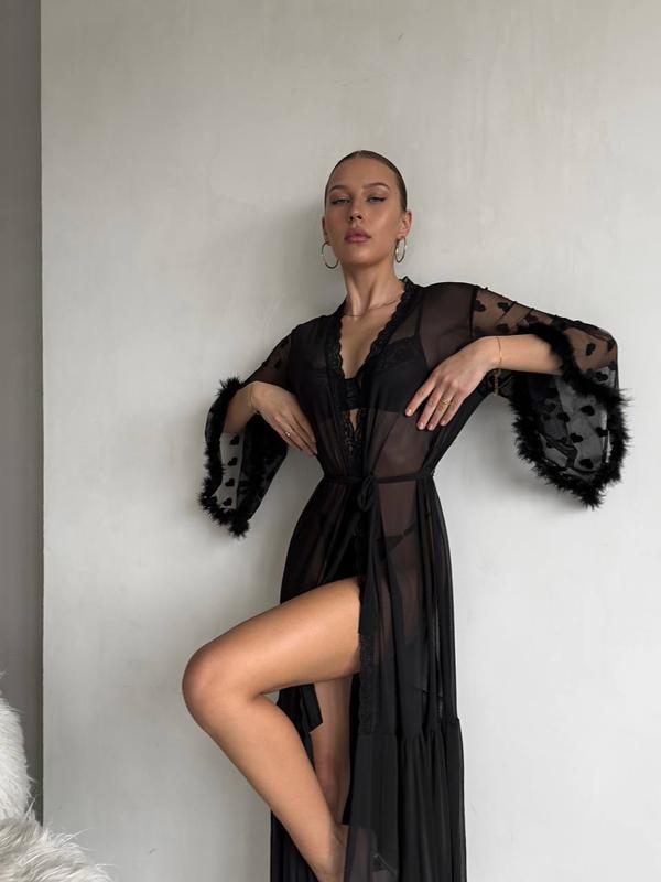 Чорний довгий халат із прозорої сіточки з пушком на рукавах