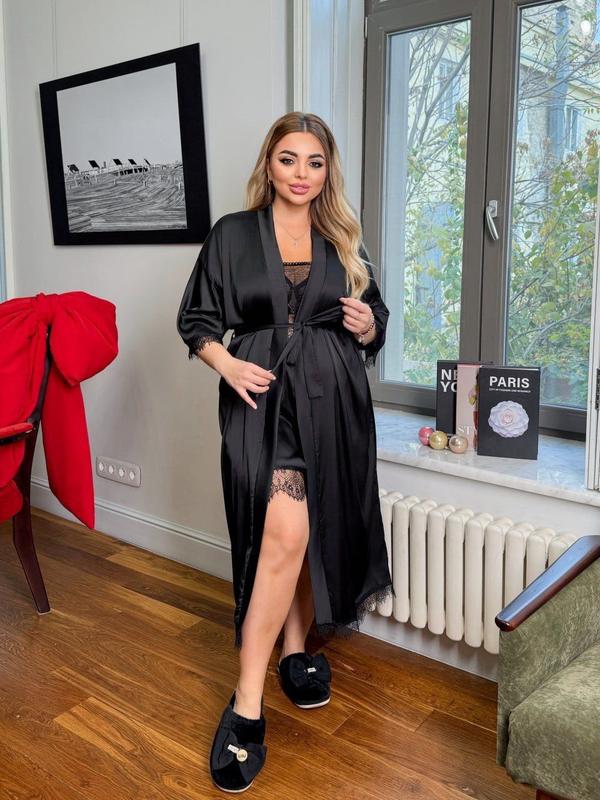 Модель №505. Халат. Рукав 34 обработан французским кружевом. Ткань Армани шелк, не тянется. Состав: Полиэстер - 95%, Хлопок - 5%. Цвет: Красный, Черный, Фреза. Размеры: 42-44, 46-48, 50-52, 54-56, 58-60. Мерки халата 505 по готовому изделию 42-44 Объем груди халата - 100 см, Объем талии халата - 100 см, Объем бедер халата - 100 см, Длина халата - 116 см, Длина рукава халата - 30 см 46-48 Объем груди халата - 110 см, Объем талии халата - 110 см, Объем бедер халата - 110 см, Длина халата - 117 см, Длина рукава халата - 30 см 50-52 Объем груди халата - 120 см, Объем талии халата - 120 см, Объем бедер халата - 120 см, Длина халата - 118 см, Длина рукава халата - 30 см 54-56 Объем груди халата - 130 см, Объем талии халата - 130 см, Объем бедер халата - 130 см, Длина халата - 119 см, Длина рукава халата - 30 см 58-60 Объем груди халата - 140 см, Объем талии халата - 140 см, Объем бедер халата - 140 см, Длина халата - 120 см, Длина рукава халата - 30 см