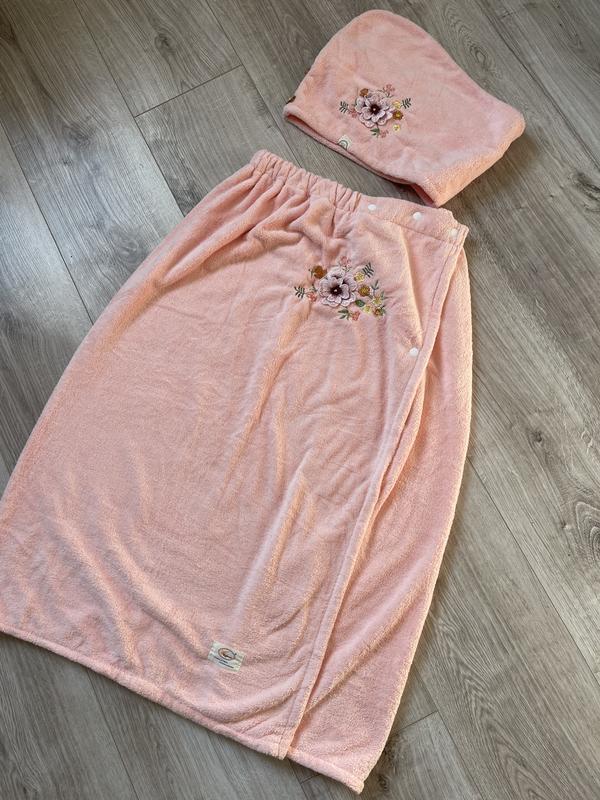 Набір для сауни жіночий на кнопках koloco мікрофібра, халат-рушник на гумці та чалма на во...