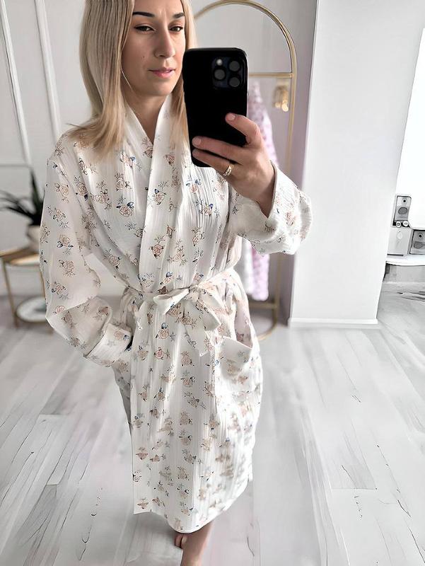 Новинка ❤️ Мод 319 Халат з мусліну 📍Ткань - муслин 📍Размеры :42-46,48-52 Халат на запах, с поясом, на завязках внутри, до колена. Размер халата регулируется глубиной запаха. Воздушная и комфортная, приятная к телу ткань. Благодаря высокому качеству материала, изделие не дает усадку, практичное и простое в уходе. Цена: 1000 грн💶 имма