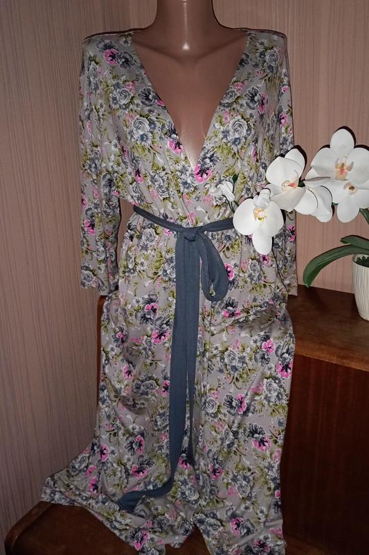 Легкий халатик для дома из вискозы на запах с поясом. Турция. Халатик новый, но без бумажной бирки (даже потерялась в магазине, когда собирали товар). Цвет- на сером фоне розовые и серо-белые цветы. Пояс темно-серый. Размер по бирке-ХЛ(50), красиво садится на размер Л(48). Замеры: ширина спины- 58см, ширина полочки-30см. Рукав 3/4, длина-40см, плечо- 13см.Общая длина халата- 112см. Длина пояса- 207см. Предоставят дополнительные фото и замеры запотребью. Пересылаю после оплаты на мою карточку.