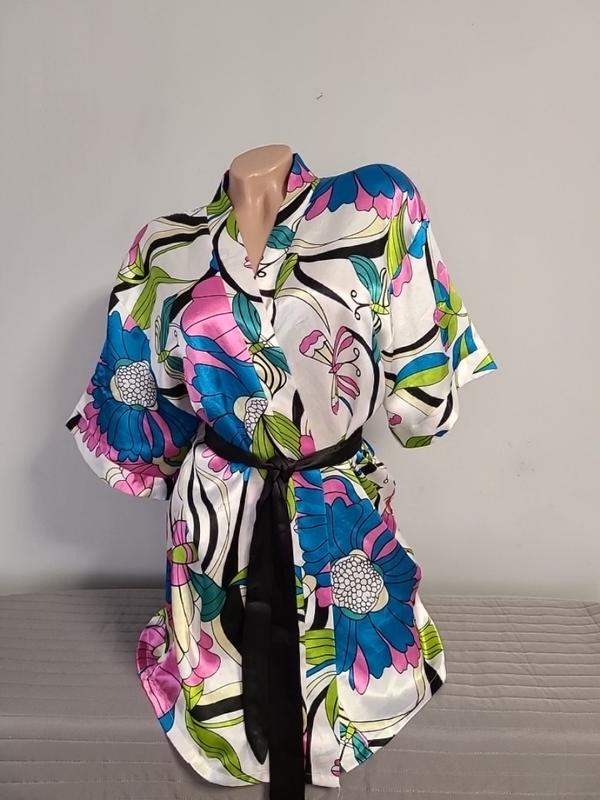 Шелковый халатик 44/46 размер, замеры плечи спущенные 53 см, пог 54 см, поб 57 см, длинна 80 см.Есть нюанс, пояс не с него.