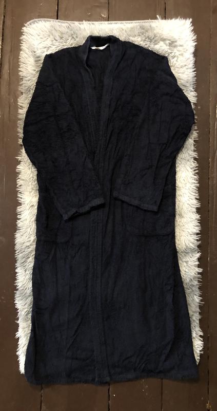Халат махровий, приємний до тіла, має кишені, тканина не тягне. Заміри: півобхват грудей 58 см, півобхват талії 55 см, півобхват стегон 55 см, ширина по низу 59 см, довжина халата 118 см, довжина рукава від горловини 75 см. Підійде на розмір М, Л. Стан ідеальний