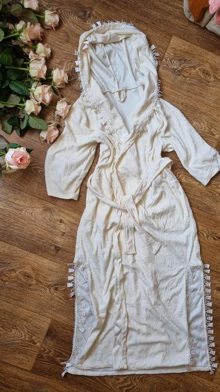 Ажурные халат 🌸✨️ Бирка срезана не могу точно сказать что за состав производство Турция не коттон надевался около двух раз был куплен для фотосессии 🍀смотрите другие мои объявления цвет ближе к молочному Длинна по спинке 123см Длинна рукава 38 см объём груди 104см объём бедер 110 см Длинна разреза 42см Длинна разреза на рукаве 8см высота капюшон от спинки 30см