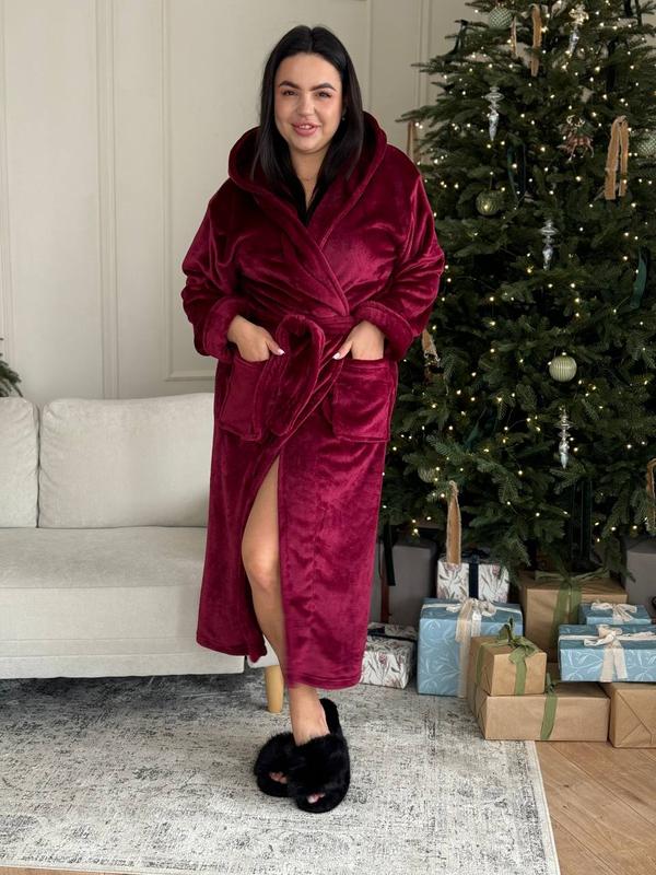 Женский теплый плюшевый длинный халат с карманами капюшоном и поясом 2хл 3хл хл бордо