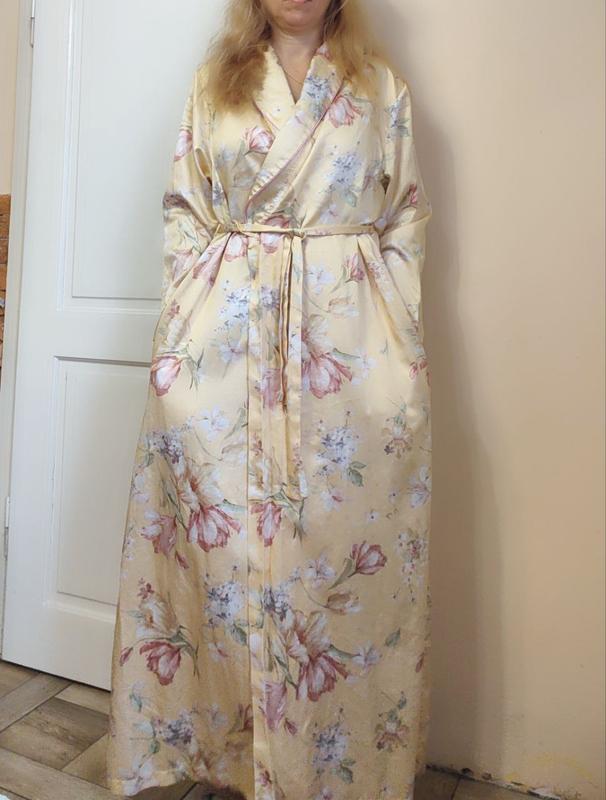 Длинный женский атласный халат в нежном, домашнем стиле. Халат светло-желтого цвета с крупным цветочным принтом в розово-сиреневых и зеленоватых тонах. Халат имеет классический запаховой крой с завязывающимся поясом на талии, а также отложной воротник с кантом по краю, который добавляет аккуратности. По бокам прорезные карманы. Макси длина - до щиколоток создает ощущение элегантности и комфорта. Размер М, но подойдет и на L. Длина 134 см. НОГрудей (по спині) - 58, 5 см. Длина рукава - 54,5 см. Халат в очень красивом состоянии, но есть нюанс (последнее фото), почти незаметно голым глазом. Общее впечатление – элегантный, мягкий и женственный домашний халат, который сочетает удобство с изысканным видом.