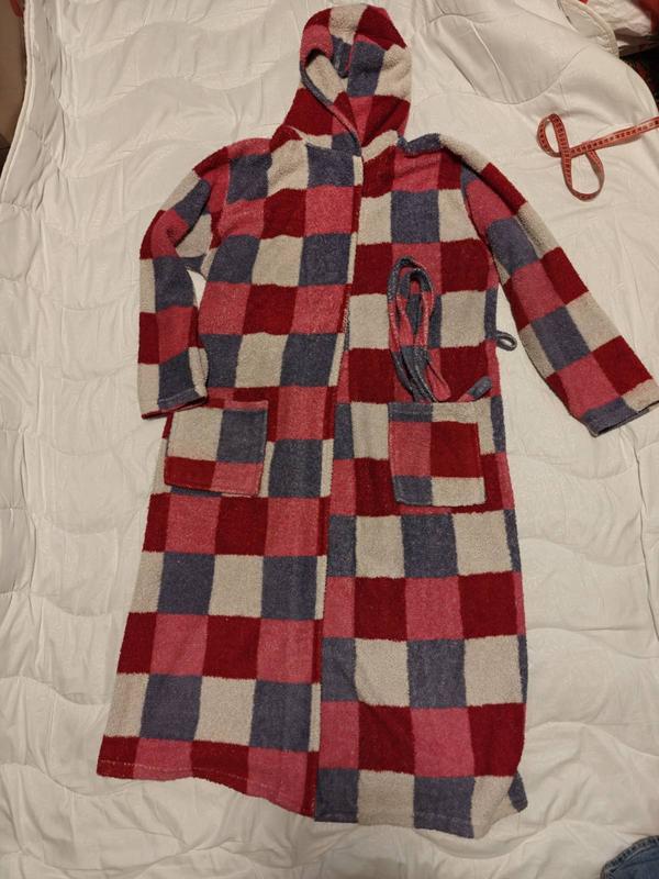 Халат домашний, банный или для дома, выполнен из махровой (плюшевой) ткани, известной своей мягкостью и способностью хорошо впитывать влагу. Халат имеет длинный крой, капюшон, накладные карманы и пояс. Замеры есть в объявлении.