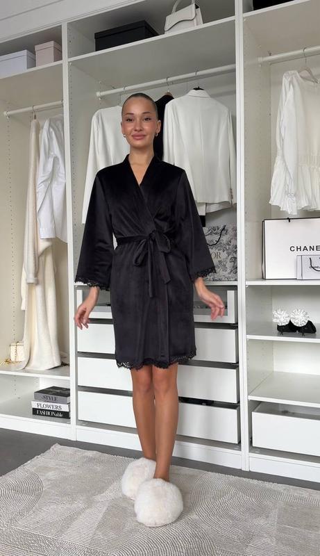New 🖤 ✔️Халат ✔️Мод.756 ✔️Розмір:42-46,48-52 ✔️Тканина: Велюр ✔️Колір: чорний, шоколад ✨ Елегантний халат Ніжність, комфорт і розкіш в одному образі. М’яка тканина огортає тіло, а витончене мереживо на рукавах та подолі додає жіночності. Пояс підкреслює талію, створюючи акуратний силует. Ідеальний для ранкових ритуалів, домашніх вечорів та відчуття преміум-комфорту щодня. ✔ М’який, приємний до тіла матеріал ✔ Мереживні акценти ✔ Стильний універсальний крій ✔ Преміальний вигляд Створюй свій домашній шик із перших хвилин дня 💫