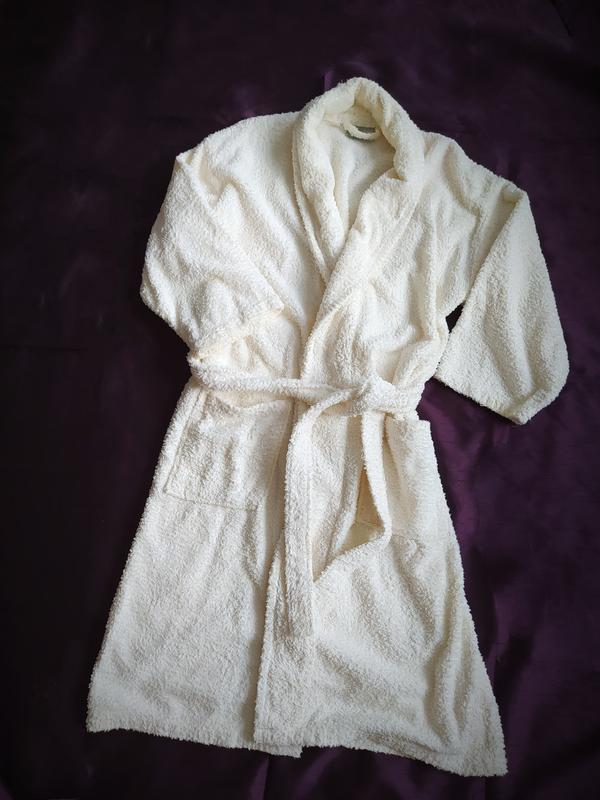 Махровый халат Dunelm в очень хорошем состоянии. Небольшой недостаток на последнем фото. Длина 107 см, ширина по спине 58 см, рукав 43 см, плечи 57 см.