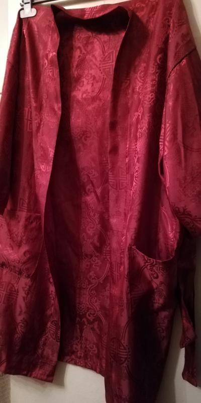 Халатик на запах Красивый бордовый цвет и рисунок.Ткань с переливом. Есть два накладных кармана и пояс. Этикетка только одна. Думаю полиэстер,но очень мягкий..Дл.88 см Пог56 см
