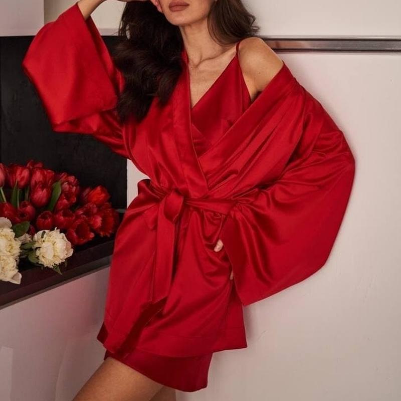 #Халат Артикул: 688-748 Цвет: шоколад, молочный, красный, цветы бежевые , зелёные листья Размеры: универсал 42-46 Материал: шёлк Сатин 90% полиэстер, 8% вискоза, 2% эластан Фото Реал