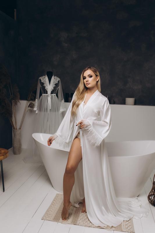Довгий будуарний халатик з роширеним рукавом , оздобленим страусиним пірям. Спідниця розширена, з шлейфом. Розмір S, M, L, XL, XXL.