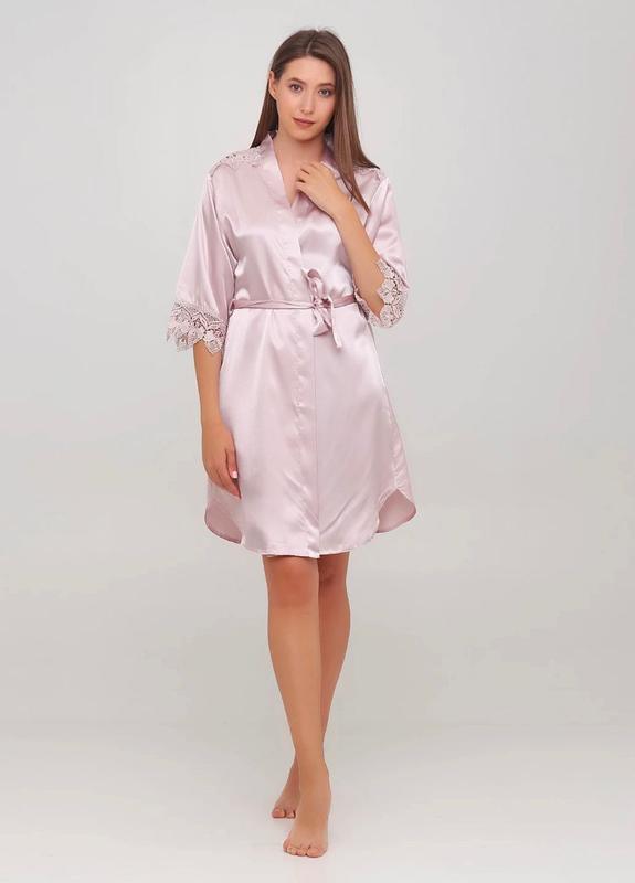 Атласний халат на запах із поясом. Модель середньої довжини. Виріб прикрашений мереживом. На розмір S довжина виробу 95 см, довжина рукава 39 см.