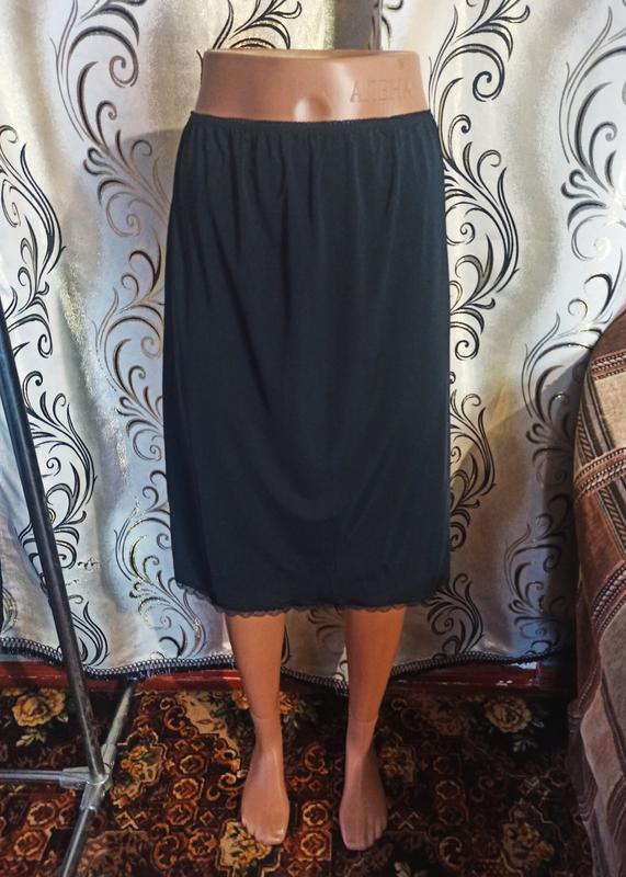 Елегантний під'юбник Marks & Spencer. Розмір - UK 20 EUR 48. Заміри: ширина в поясі 40-60 см, напівобхват стегон 61-67 см, напівобхват внизу 66 см, довжина 60 см. Склад: 85% поліестер, 15% еластан. В ідеальному стані