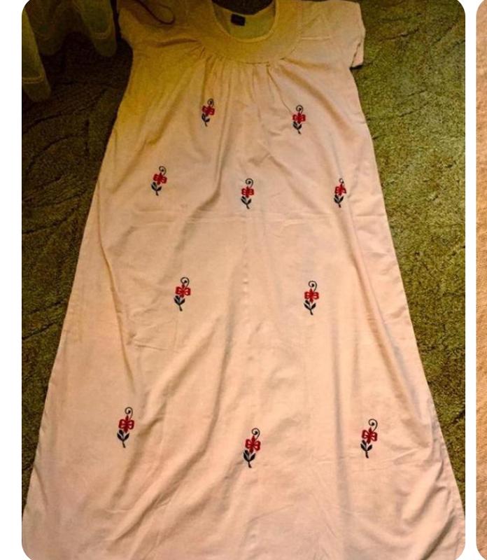 Качество шикарное цвет абрикосовый Вышитые цветы Ткань приятная к телу Выглядит шикарно Длина по спинке 123 см Объем груди от бокового шва до шва бокового 55 см