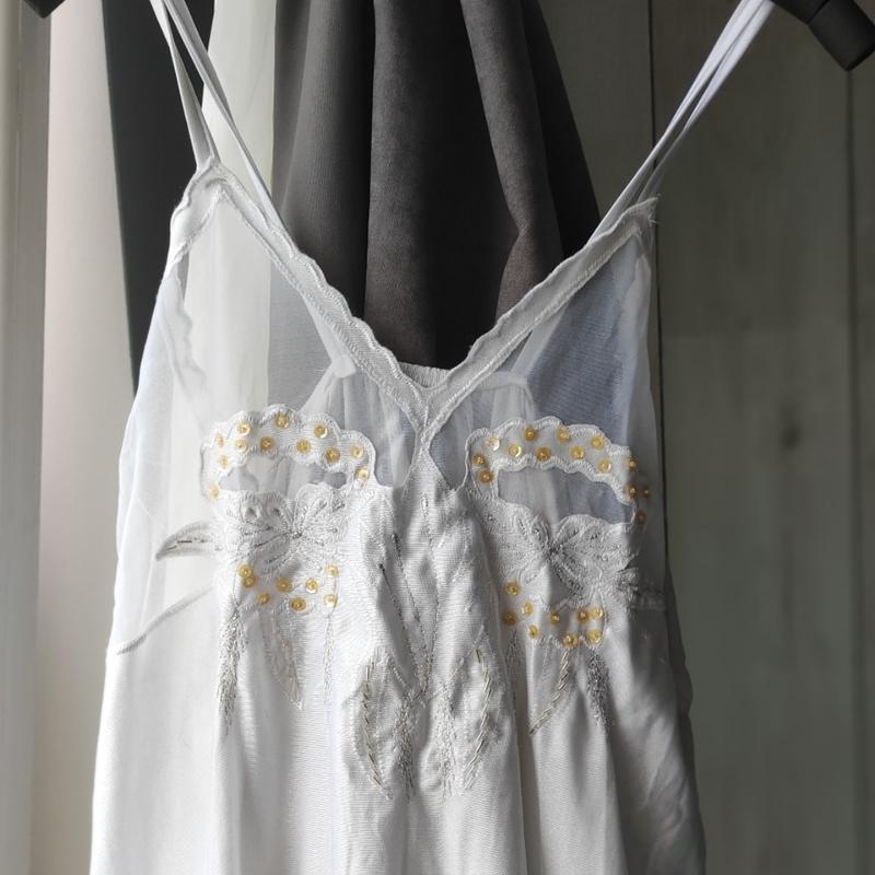 Атласная вышитая рубашка на бретельках с халатиком. Чрезвычайно приятная ткань и красивая вышивка с серебристыми нитями и бисером. Отличные узоры по рукавам и краям халата. Довжина 130 см. Рукава 49 см. Плечі халату 49 см.