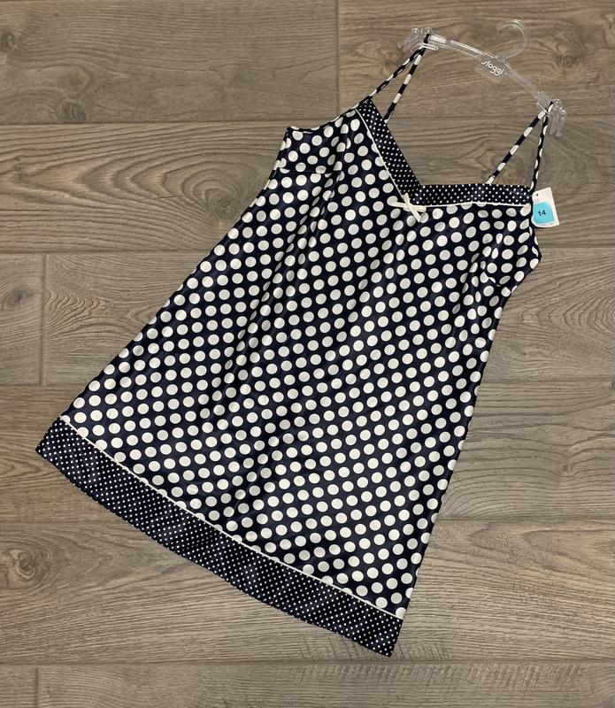 Ночнушка/ночная рубашка Marks & Spencer р. 14/42/XL- подойдет на р. 12/40/L ПОГ 48 см ПОТ 48 см ПОБ 54 см Длина вместе с бретелями 82 см Бретели регулируются Цвет - темно-синий в белый горох.