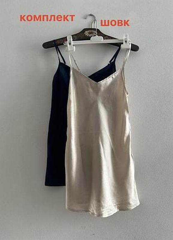 Комплект одного размера. Продаются по указанной цене-если отдельно то шт 250 грн Цвет синий,беж. Без дефектов. К сожалению все бирки срезаны. Ткань 100 процентов шелк. Бретельки регулируются. Длина от плеча 65 пог 44-48 пот 37-44 по низу 44-47 Сбоку распорки 7 см