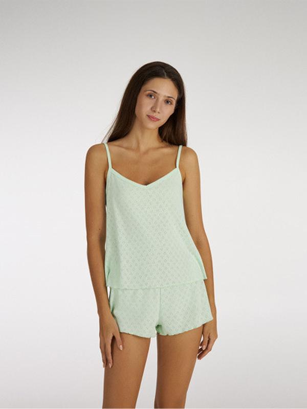Бабовняна піжамка, з перфорованим принтом в вигляді сердець, приємного м‘ятного кольору. Колір як на фото 1. Склад: 100% бабовна.