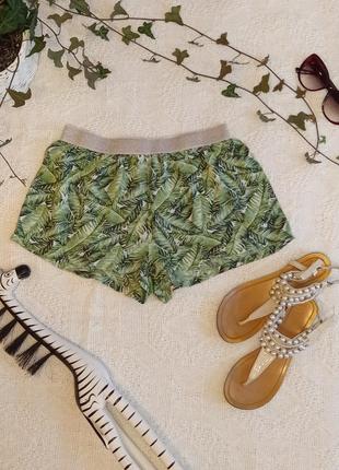 Шортики для сну та відпочинку в тропічний принт. Натуральна, приємна на дотик тканина, срібляста резинка. Довжина 25 см, стегна 102 см.