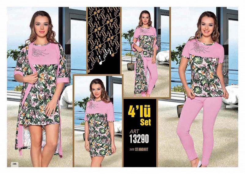 Комплект из 4-х предметов хлопок 13290 TM Lady Lingerie Женский комплект состоит из 4-предметов: ночной рубашки и майки на бретельках, халата и лосин. Комплект подарит вам комфорт и привнесет женственность в ваш домашний образ. В таком наряде одинаково удобно отдыхать, спать или заниматься домашними делами, накинув халат. Изделие из мягкого хлопкового трикотажа очень приятные на ощупь, превосходного качества и отличным пошивом. Характеристики: Состав: 93% хлопок, 7% эластан Комплектация: ночная рубашка + халат Размер: 44-46 cтандарт Упаковка: фирменная полиэтиленовая Производитель: Турция