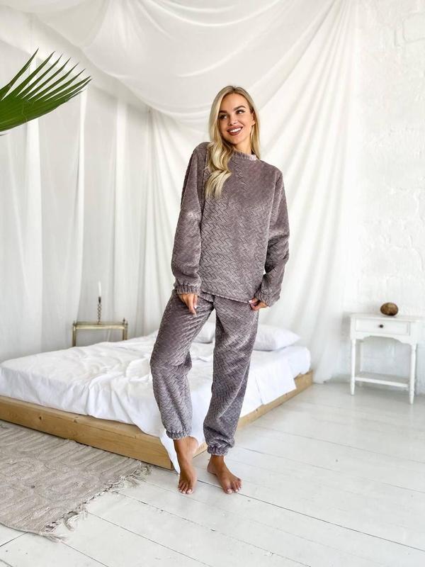 Теплая женская пижама для дома из двухсторонней махры велсофт повседневный теплый костюм для женщин цвет мокко Этот женский домашний костюм является настоящим источником тепла и уюта. Изготовленный из высококачественного материала, он создан, чтобы придавать вам чувство комфорта и доставлять радость каждому вашему вечеру. Этот невероятно стильный комплект включает в себя мягкие брюки и куртку, изготовленные из турецкой двухсторонней махры велсофт. Эта ткань также обладает впечатляющими теплоизоляционными свойствами, благодаря которым вы можете быть уверены, что вы останетесь теплыми даже в самые холодные дни. Махра Велсофт дарит вам чувство безопасности и уюта, которое особенно ценится в холодное время года. Этот домашний костюм также поражает своей элегантностью и стилем. Вы можете выглядеть отлично даже дома. Кроме того, его уход очень прост. Ткань легко стирать и гладить, что делает его идеальным выбором для ежедневного использования. Расскажите себе, что вы заслуживаете лучшего, и подарите себе этот домашний костюм. Он станет вашим любимым элементом гардероба и надежным спутником в холодные дни, придавая вам ощущение тепла, комфорта и элегантности, которые вы заслуживаете. Розміри: 42-44; 46-48; 50-52; 54-56 размер 42-44 Кофта: ОГ 102 см; ОТ 102 см; Длина 67 см; Длина рукава 64 см; Штаны: ОТ 70-90 см (на резинке); ОБ 100 см; длина: 98 см; вн.ш.-73 см размер 46-48 Кофта: ОГ 108 см; ОТ 108 см; Длина 69 см; длина рукава 65 см; Штаны: ОТ 74-94 см (на резинке); ОБ 108 см; длина: 99 см; вн.ш. -74 см размер 50-52 Кофта: ОГ 116 см; ОТ 116 см; Длина 70 см; Длина рукава 66 см; Штаны: ОТ 80-100 см (на резинке); ОБ 116 см; длина: 100 см; вн.ш.-75 см размер 54-56 Кофта: ОГ 124 см; ОТ 124 см Длина 71 см; Длина рукава 67 см; Штаны: ОТ 84-104 см (на резинке); ОБ 126 см; длина: 101 см; вн.ш.-76 см ткань очень теплая и приятная к телу замеры сделаны по изделию; на модели норма размер 42-44; рост 169 см