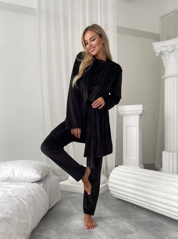 Тёплая зимняя велюровая плюшевая женская пижама домашний костюм тройка черный цвет Представляем женский велюровый набор тройка для дома! Этот роскошный женский велюровый костюм идеально подходит для стильного отдыха дома. В комплект входят футболка, штаны и халат. Комплект выполн из мягкого и приятного на ощупь велюра. Набор доступен в разных цветах. Замеры 42-44 Топ: ОГ 98см, ОТ 96см, Длина 61см Штаны: ОТ 64-84(на резинке); ОБ 102см; Длина 101см/75 внутр шов Халат: Длина 85см, рукав 62см 46-48 Топ: ОГ 102см, ОТ 100см, Длина 62см Штаны: ОТ 70-90(на резинке); ОБ 108см; Длина 102см/76 внутр шов Халат: Длина 86см, рукав 63см 50-52 Топ: ОГ 106см, ОТ 104см, Длина 64см Штаны: ОТ 76-96(на резинке); ОБ 114см; Длина 103см/77 внутр шов Халат: Длина 88см, рукав 64см 54-56 Топ: ОГ 110см, ОТ 108см, Длина 65см Штаны: ОТ 82-102(на резинке); ОБ 120см; Длина 104см/78 внутр шов Халат: Длина 90см, рукав 65см На моделях: норма- размер 42-44, рост 168см;батал - размер 50-52 рост 170см Ткань очень мягкая и приятная к телу Замеры сделаны по изделию,ткань хорошо тянеться