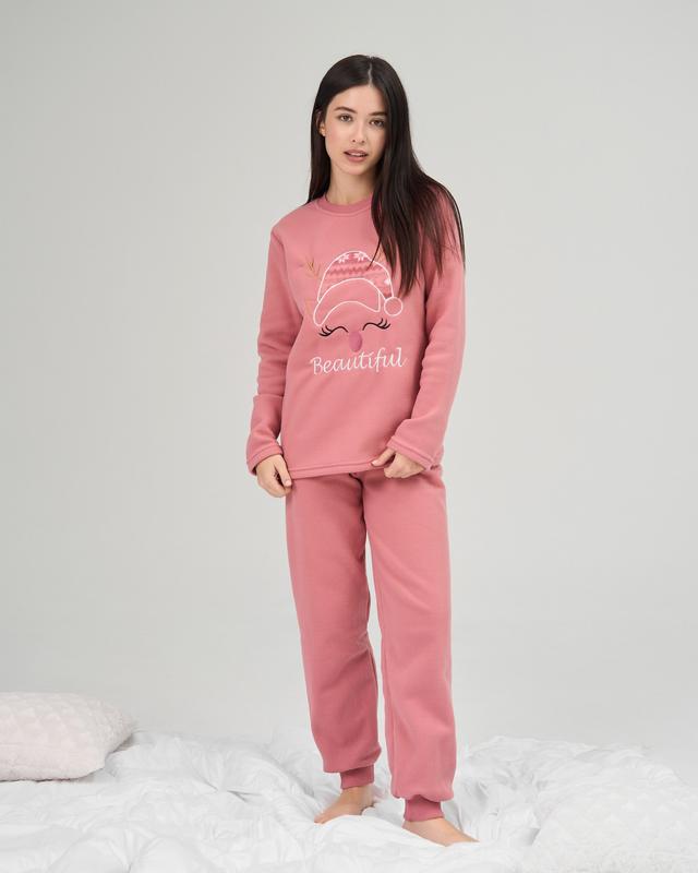 50% хлопок, 50% полиэстер Комплект женский розовый с кофтой и брюками флисовый. На кофте есть нашивка в виде мордочки оленя и надпись Beautiful. Брючины без карманов, с манжетами внизу. Такой комплект может служить как пижамкой, в которой вам будет комфортно спать, так и комплектом для дома, в котором вы можете проводить домашний досуг. Обращайте внимание на описание товара и характеристики, где указан состав ткани. Обращайте внимание на замеры и сравнивайте их с вашими похожими вещами. ЗАМЕРЫ (полуобхват груди / длина кофты / длина рукава / полуобхват талии / полуобхват бедер / длина брюк / более внутренний шов): M(46 /66 /56 /34 /55 /100 /73 ); XL(50 /68 /58 /35 /57 /105 /74). цвет сухая роза