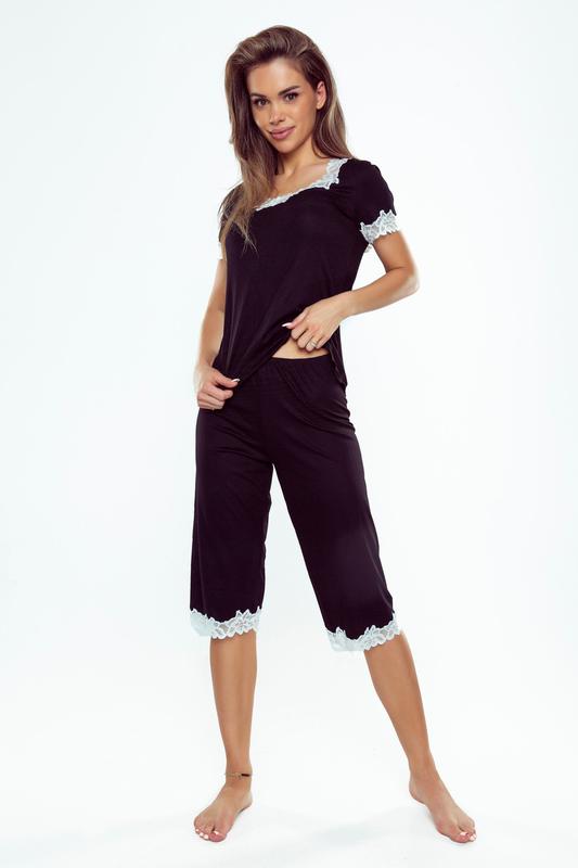 Женская тонкая пижама из футболки и бриджей черного цвета c кружевом. модель aster eldar