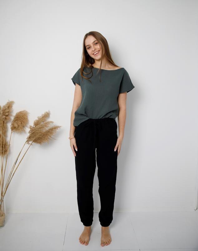 Футболка прямого кроя, сзади удлиненная, штаны с завышенной талией, внизу на резинке, поясница на резинке и шнурке. Футболку можно носить как со спущенным плечом, так и не спуская. Материал - жатый муслин (100% хлопок). Цвета: черный, хвоя, кирпич, мята. Ткань очень мягкая, приятная к телу, идеальная на лето! На фото размер S, параметры модели 89-60-89, рост 172 см. Размеры: XS (42) - на обхват груди 82-86 / обхват бедер 86-90 S (44) - на обхват груди 86-90 / обхват бедер 90-94 M (46) - на обхват груди 90-94 / обхват бедер 94-100 L (48) - на обхват груди 94-100 / обхват бедер 100-106 Дополнительные характеристики: Материал : Хлопчатобумажная ткань Товар под заказ