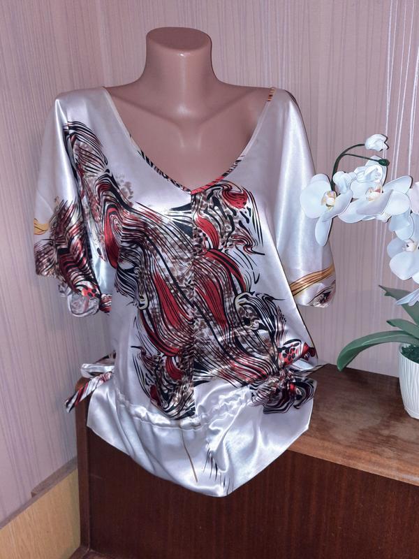 Верхний блузон от костюма для для дома (пижамы). Фасон-"летающая мышь", снизу затягивается на шелковую ленту. Вырез мысом. Размер-ХЛ (50). Замеры: ширина в груди-58см, в талии- 55см. Пересылаю после оплаты на карточку.