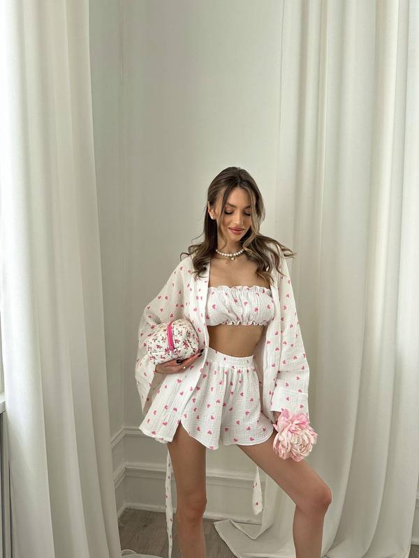 • материал - муслин принт • халатик, топ, шорти Размер по сетке: S груди: 82- 89 см, стегна: 85 - 93 см. М грудь: 89 - 94 см, бедра: 93 - 100 см L грудь: 94 - 99 см, бедра: 100 - 107 см XL груди: 99 - 105 см, стегна: 107 - 114 см. Арт. #00483